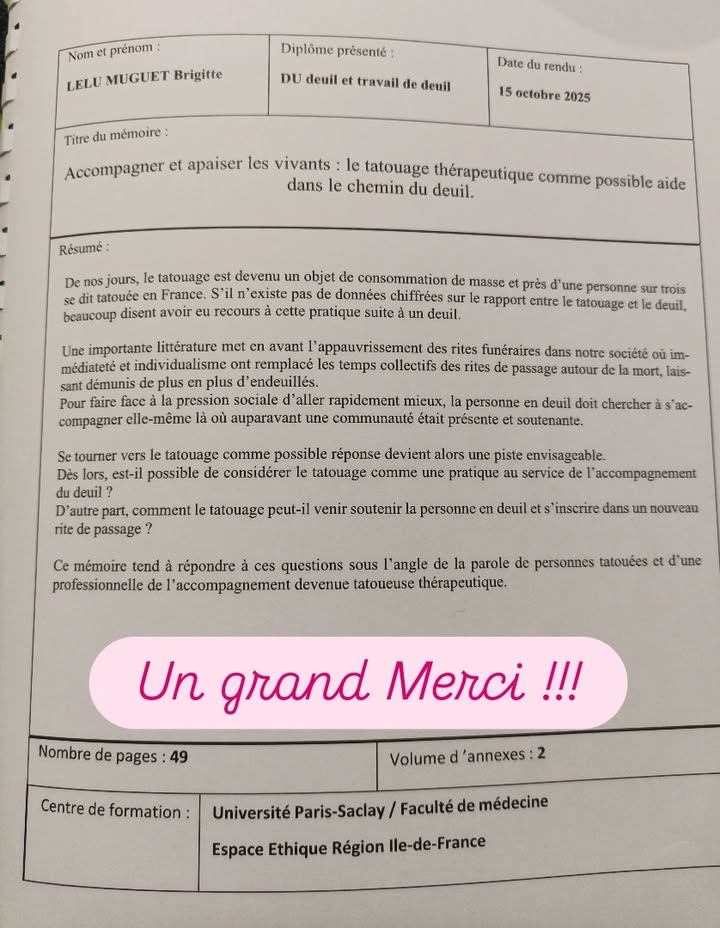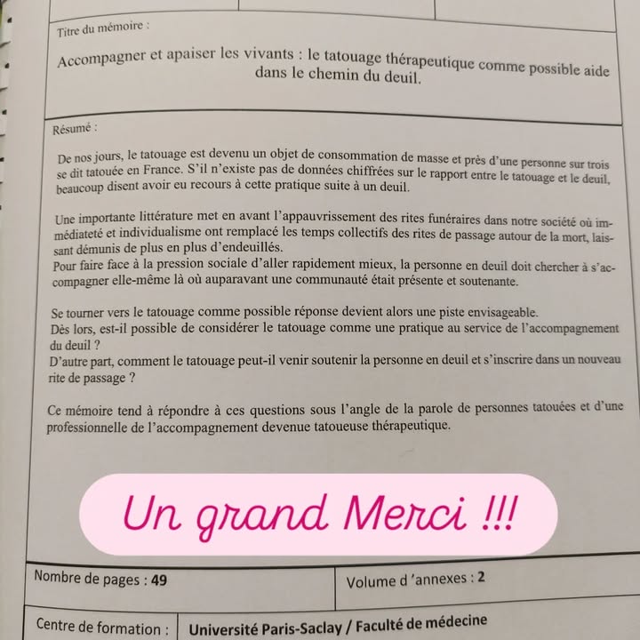 Publié sur Sophie Trémeur5. Novembre, 2024 Brigitte à un accompagnement global, une écoute, du conseil et beaucoup de douceur. Mon tatouage est magnifique, une belle réalisation inventive correspondant exactement à mon histoire personnelle et mon intention. Merci beaucoup 🙏Publié sur Mauricette Rauline28. Octobre, 2024 Un 1er tatouage pour moi thérapeutique suite au décès de mon époux une étape douloureuse de la vie et Brigitte a été à mon écoute, bienveillante, a su mettre des mots sur mes maux . j'ai rencontré une très belle personne. Elle sait mettre à l'aise, à beaucoup d'empathie. Merci Brigitte pour tout. Pour les tatouages qui ont une très grande signification et une très grande importance pour moi pour continuer mon chemin de reconstruction. Vous êtes une tatoueuse formidable et je recommande vivement votre salon qui porte bien son nom chemin d'ancrage.Publié sur M N14. Octobre, 2024 Merci Brigitte pour ton écoute très attentive, ta patience, tes dessins magnifiques et tes deux tatouages l'un énorme sur le bras qui t'a pris tant de temps et l'autre très symbolique sur la colonne!Publié sur Isabelle24. Juin, 2024 Brigitte est très à l'écoute et m'a permise de m'approprier ma cicatrice après un cancer du sein et d'être enfin apaisée. C'était mon premier tatouage et je ne savais pas trop quel pouvait être le rendu. J'en suis très satisfaite. De plus j'ai été très bien accueilli et mise à l'aise. Je recommande,Publié sur Rose Bourde16. Juin, 2024 Une expérience hors des sentiers connus, une connexion et reconnexion à la personne porteuse d un passé/ présent ancré dans l avenir de la joie et de l envie du partage. Une gratitude heureuse sincère et vogant vers la simple légèreté du vrai. RosePublié sur Juliette Jamin11. Juin, 2024 Je ne sais comment remercier Brigitte, les mots ne suffiront pas. Un tatouage a bien souvent une symbolique mais avec Brigitte cela va au delà. Sa démarche est vraiment magnifique. Au delà du tatouage c’est une belle rencontre avec une personne bienveillante et à l’écoute. J’ai été bluffée à quel point Brigitte a très vite cerné le message dans mon histoire et la portée. Un seul dessin aura suffit. La réalisation du tatouage se passe dans d’excellentes conditions, Brigitte est très à l’écoute et explique très bien à la fois le déroulé mais aussi les précautions à prendre et l’entretien.Ce tatouage s’inscrit complètement dans mon parcours thérapeutique et plus j’avance plus je suis émerveillée par le message de l’envol et je continue de déployer mes ailes et me libérer. Le tatouage me rappelle ce cadeau que je me suis fait et le chemin que j’ai parcouru. Il m’accompagne dans ma nouvelle identité et mon nouveau moi. Comme les mots ne suffisent pas à vous dire combien je vous remercie je vous le dis grâce à l’émotion qui m’a habité lorsque j’ai découvert le tatouage sur moi et qui continue de m’envahir lorsque je regarde le tatouage.Publié sur maryline chauvin10. Juin, 2024 Personne accueillante et qui comprends notre mal être, elle nous laisse parler et ensuite nous prévoyons ou pas d'ailleurs un tatouage ensemble personnaliséPublié sur Oceane Sonnet3. Juin, 2024 Je tiens à partager mon expérience avec Brigitte ! Étant donné que c'était mon tout premier tatouage, j'avais beaucoup d'appréhensions concernant la douleur. Cependant, dès le premier instant, elle a su me mettre à l'aise et apaiser mes craintes. Mon tatouage n'est pas simplement un "dessin irréfléchi", il représente quelque chose de très personnel et important pour moi. Brigitte a pris le temps de m'écouter attentivement et de comprendre ce que je voulais réellement. Grâce à son talent et à son professionnalisme, elle a réussi à créer un design qui me convient. Je suis extrêmement satisfaite du résultat final. Je recommande vivement ce salon de tatouage ! Merci encore pour cette expérience :)Publié sur Péma Lair2. Mai, 2024 J'ai fait mon premier tatouage avec Brigitte, c'était parfait :) Elle était a l'écoute du début jusqu'à la fin, je me suis sentie comprise. Et le résultat a respecté mes attentes. Je suis plus que satisfaite du résultat final ce tatouage est devenu une part de moi même. Merci beaucoup Brigitte pour ton talent et ta bienveillance Je reviendrai probablement ;)Publié sur Maryline Bosqui11. Avril, 2024 Brigitte, merci pour ton accompagnement sur le chemin de mon nouveau Tatouage. Ce fut un réel plaisir de cheminer avec toi pour ce nouveau voyage qui m’emmène vers le soleil. Merci merci pour ton professionnalisme, Pour ton écoute et ta bienveillance, je la recommande vivement.Évaluation Google : 5.0 sur 5, Basée sur 35 avis